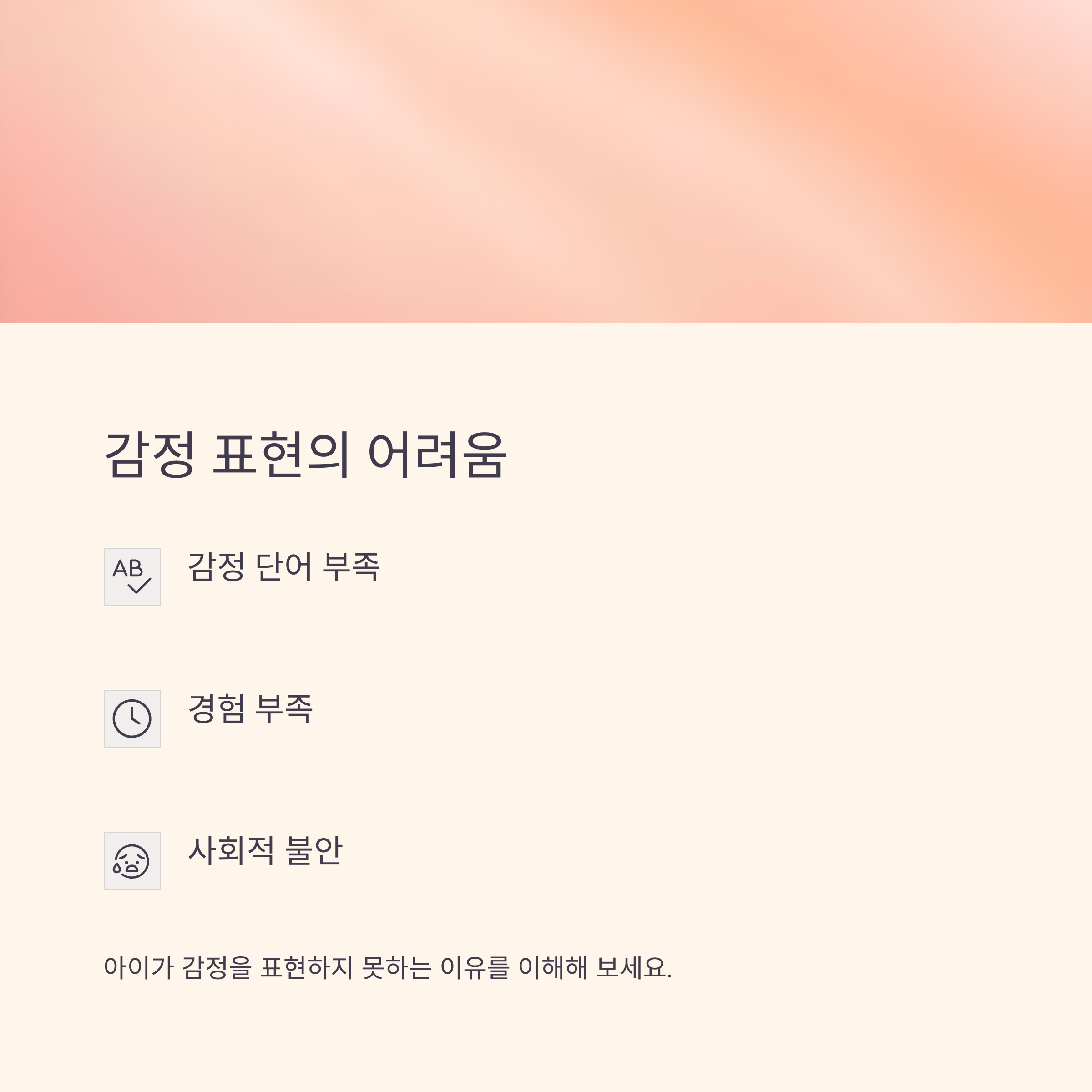 | 감정 표현이 어려운 이유 | 감정 단어 부족, 경험 부족, 사회적 불안 |