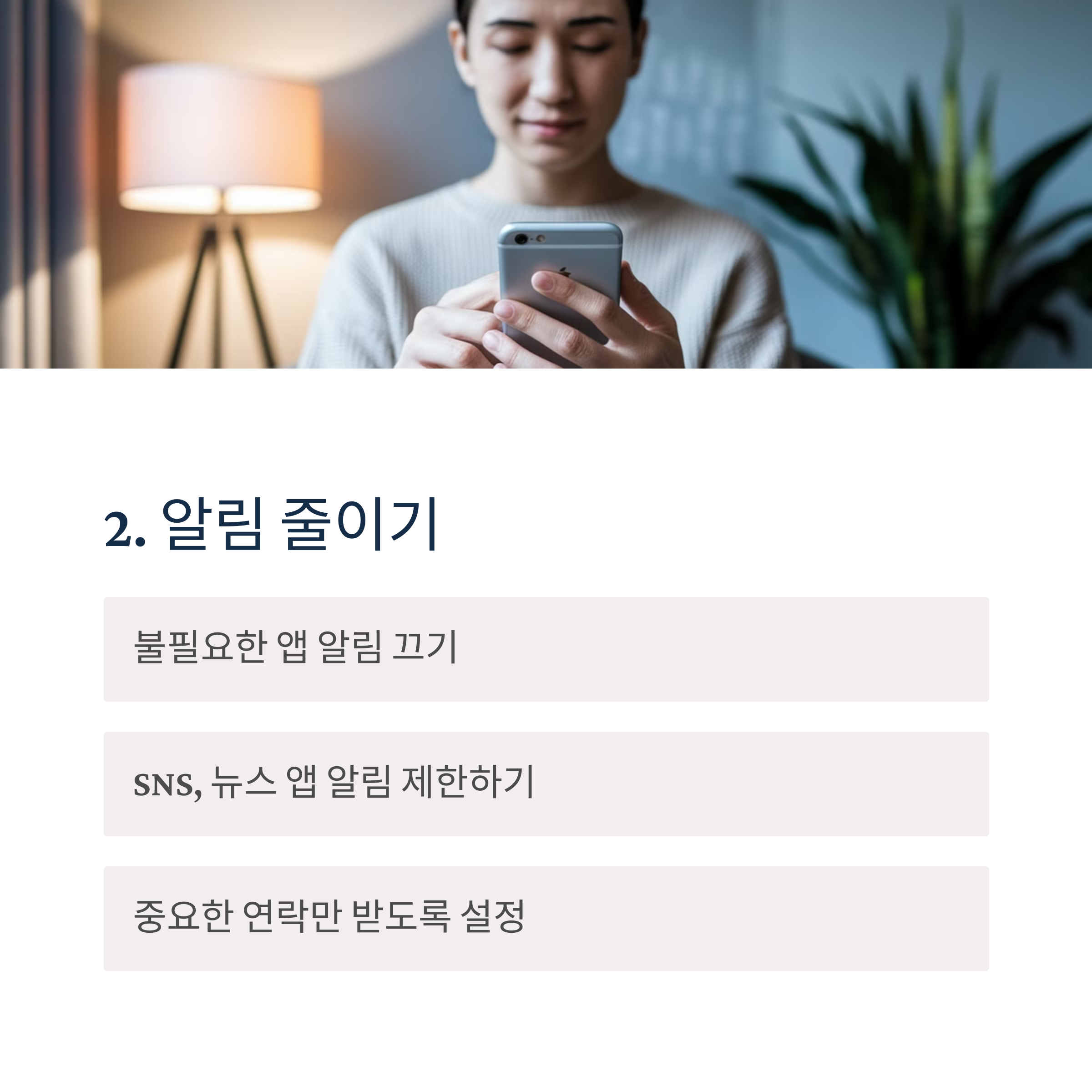 스마트폰 사용 시간을 줄이는 것은 단순한 의지가 아니라, 구체적인 방법과 습관이 필요합니다. 자신만의 스마트폰 사용 규칙을 정하고, 주변 환경을 조정하면 보다 건강한 삶을 살 수 있습니다.