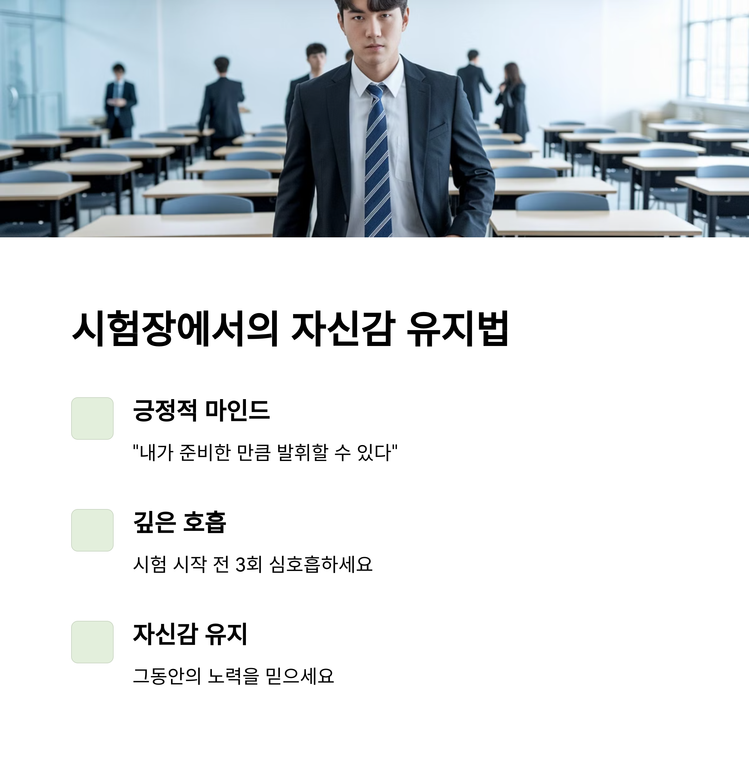 호흡을 안정시키면 심박수가 조절되고 불안감이 감소합니다. 또한, 긍정적인 자기암시를 통해 시험에 대한 자신감을 키울 수 있습니다. "나는 준비가 되어 있다", "차분하게 문제를 풀어 나가면 된다"와 같은 문장을 반복하면 자신감을 높이고 긴장을 완화하는 데 도움이 됩니다.