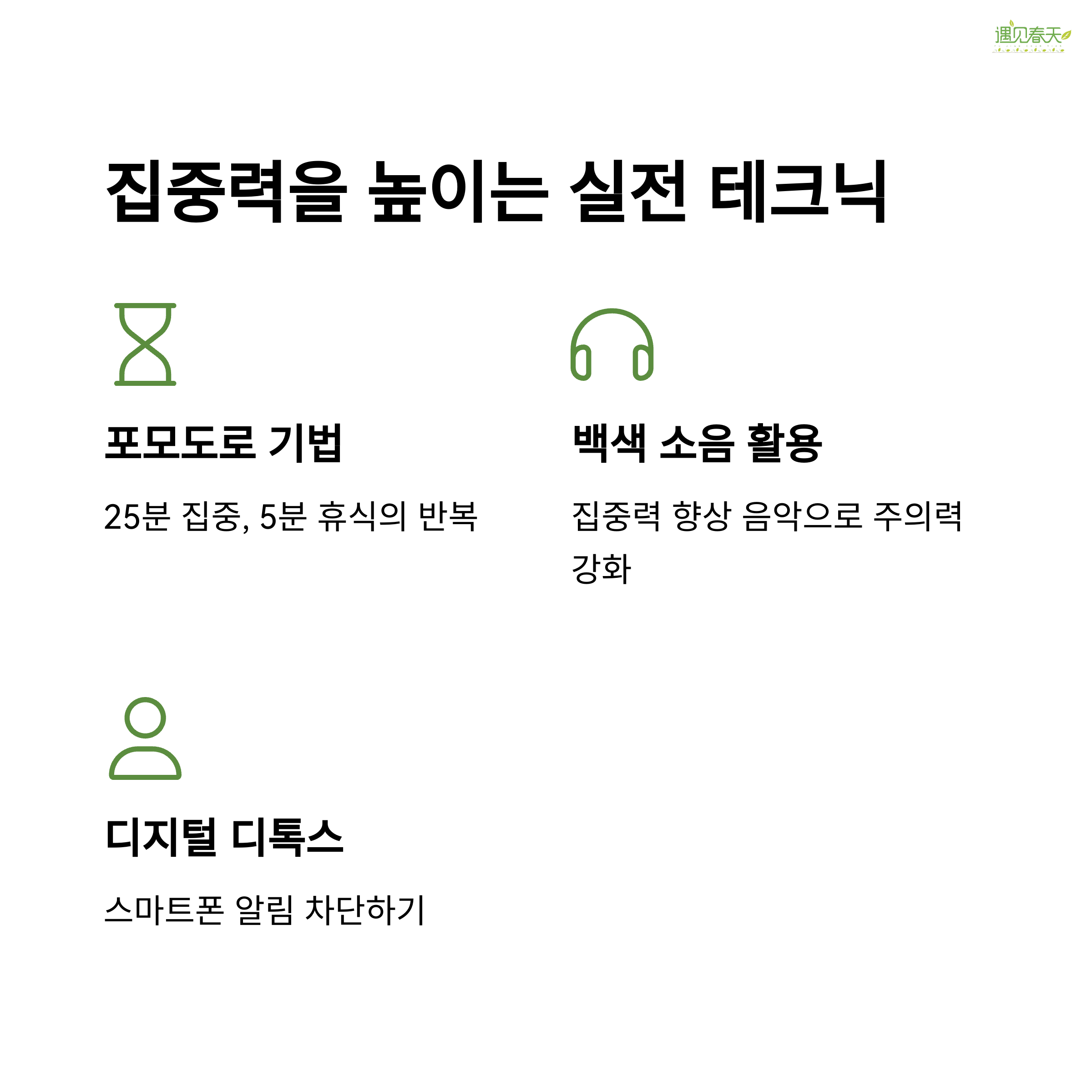 집중력을 높이려면 공부 환경을 정리하고, 방해 요소를 최소화하는 것이 중요합니다. 스마트폰을 멀리하고, 포모도로 기법(25분 집중 + 5분 휴식)을 활용하면 효과적입니다. 또한, 카페인 섭취를 조절하고 규칙적인 운동을 병행하면 집중력이 향상됩니다.