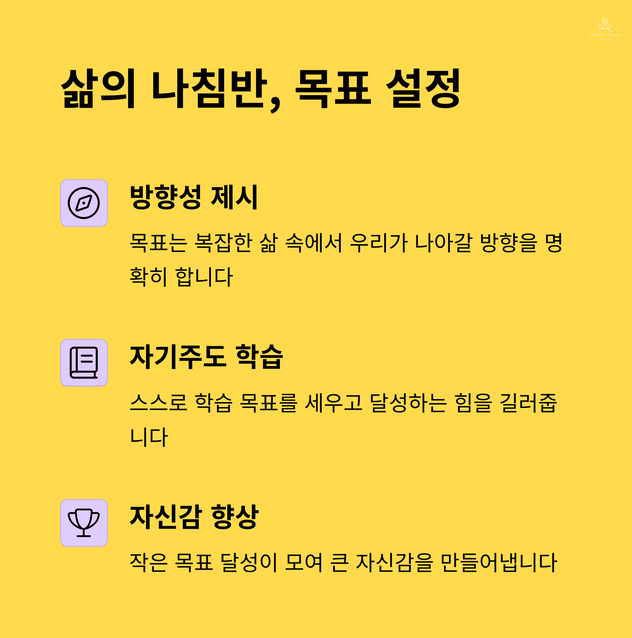 목표는 방향을 잃지 않게 도와주고, 자신감과 책임감을 키워주는 중요한 도구입니다.