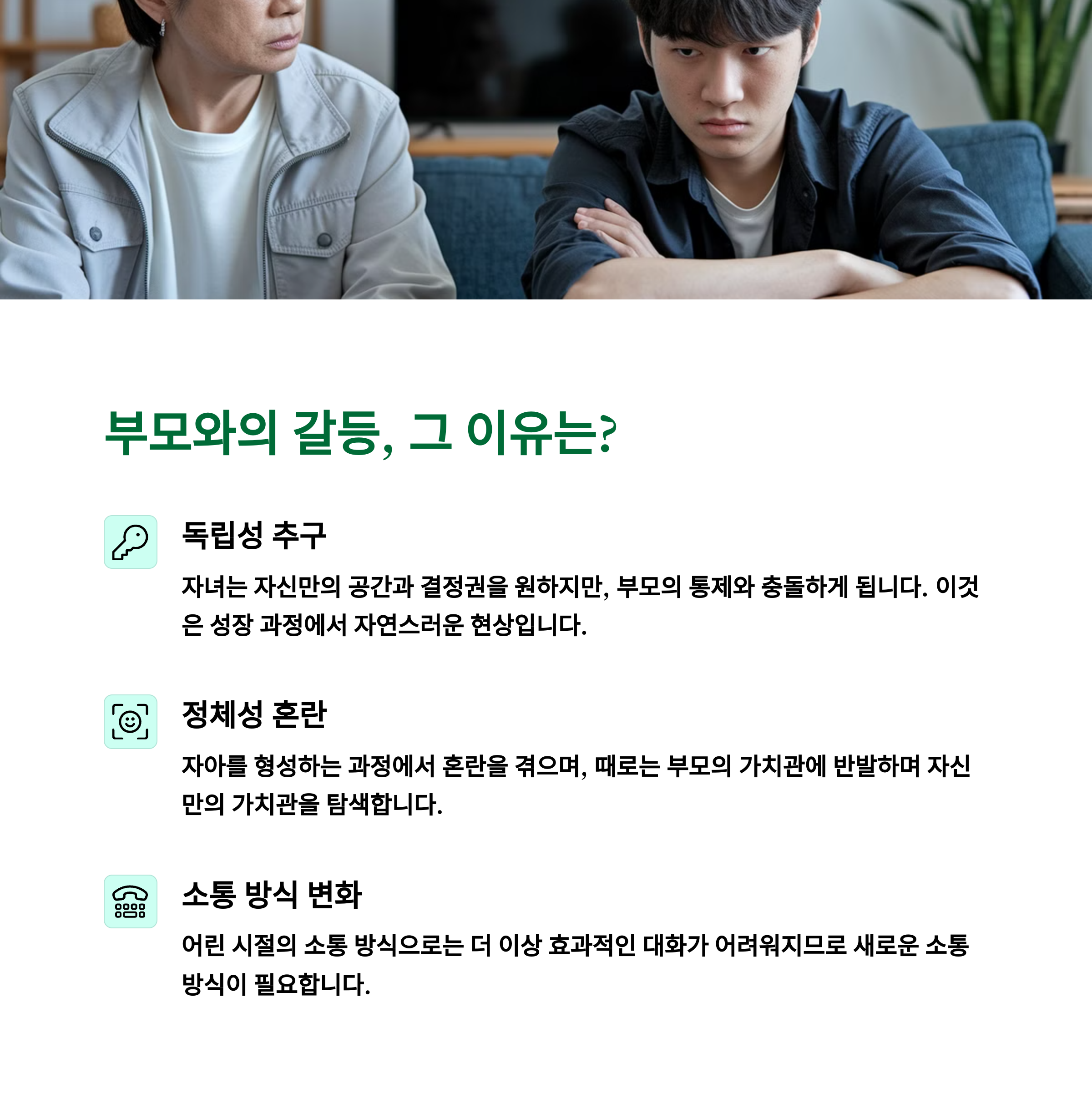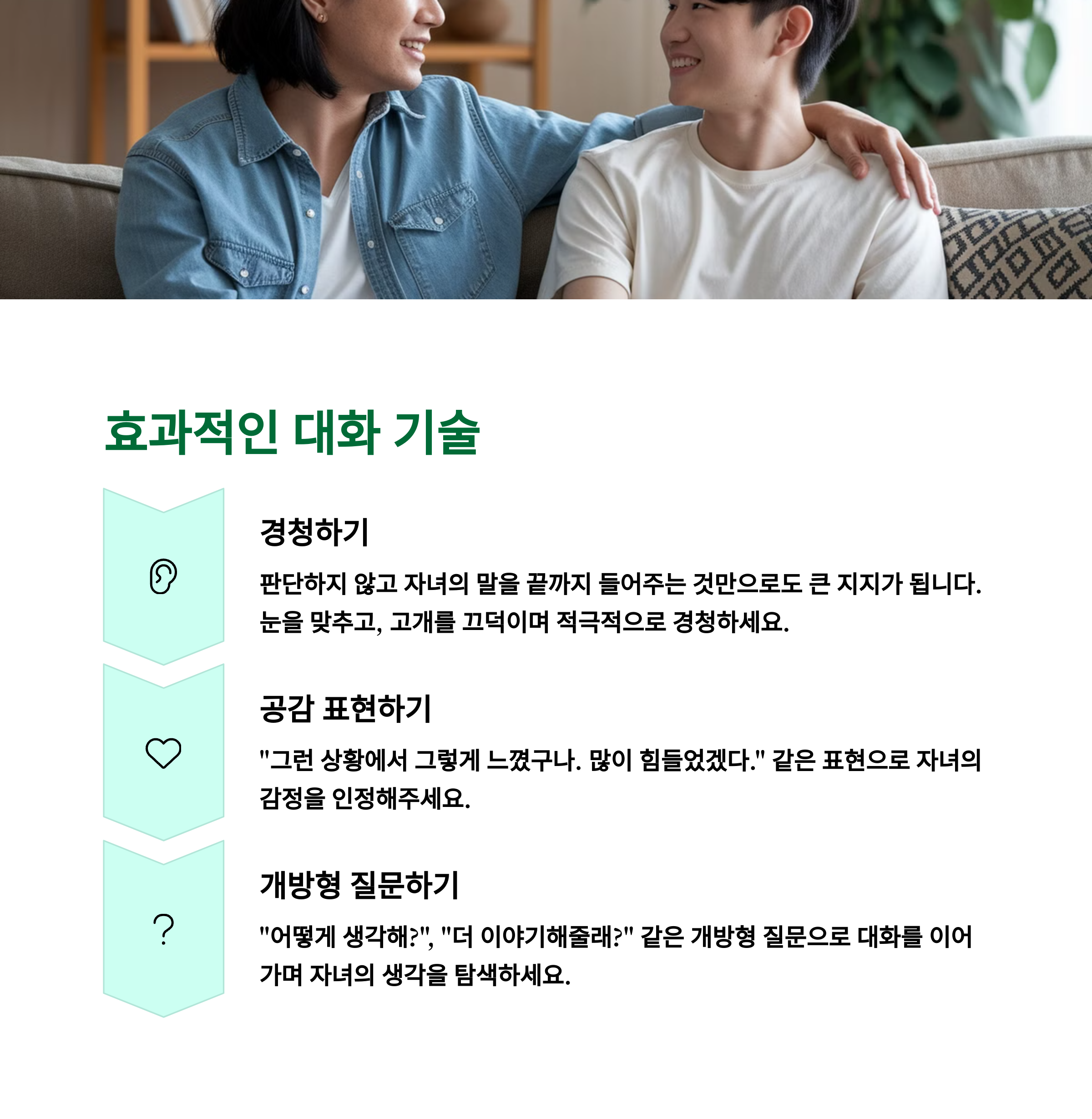 사춘기를 겪는 자녀는 어른으로 성장해가는 과도기에 있습니다. 부모가 아이의 심리를 이해하고, 감정을 함께 공감해주는 자세가 무엇보다 중요합니다. 대화의 문을 닫지 않도록 부드럽고 진심 어린 태도가 필요합니다.