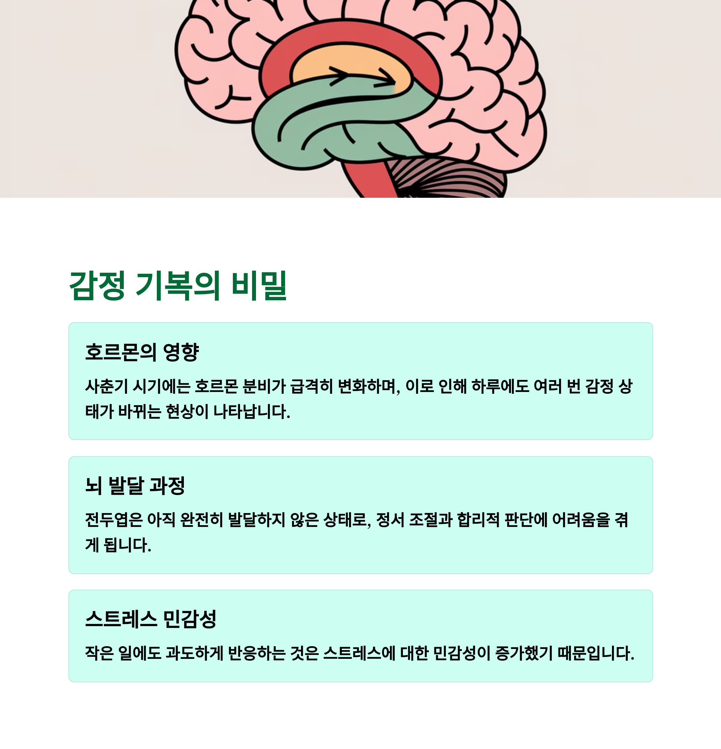 | 호르몬 변화 | 감정 기복, 충동적 행동 증가 | 예측 어려움 |