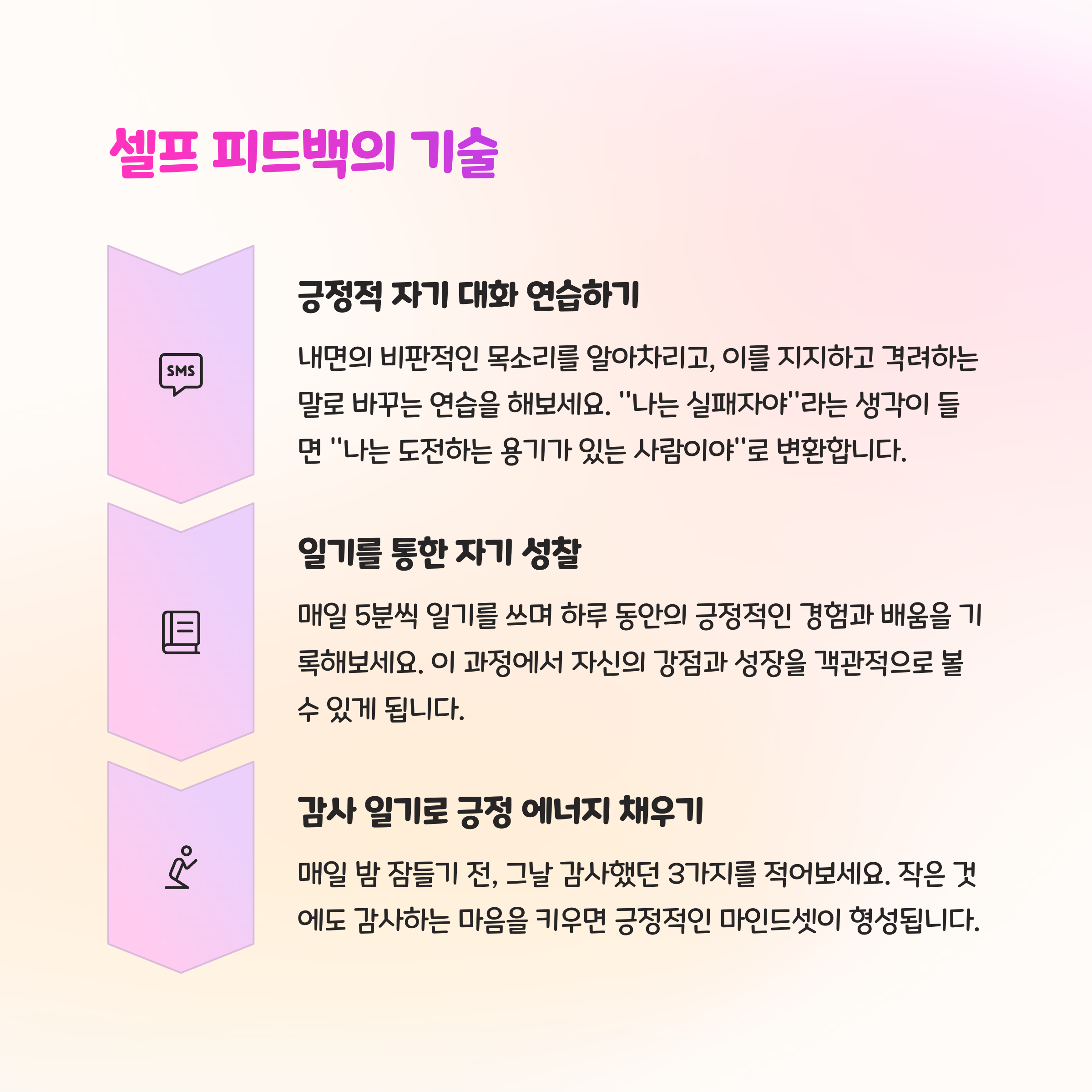 칭찬일기, 자기 대화, 피드백 메모 등 습관화하세요.