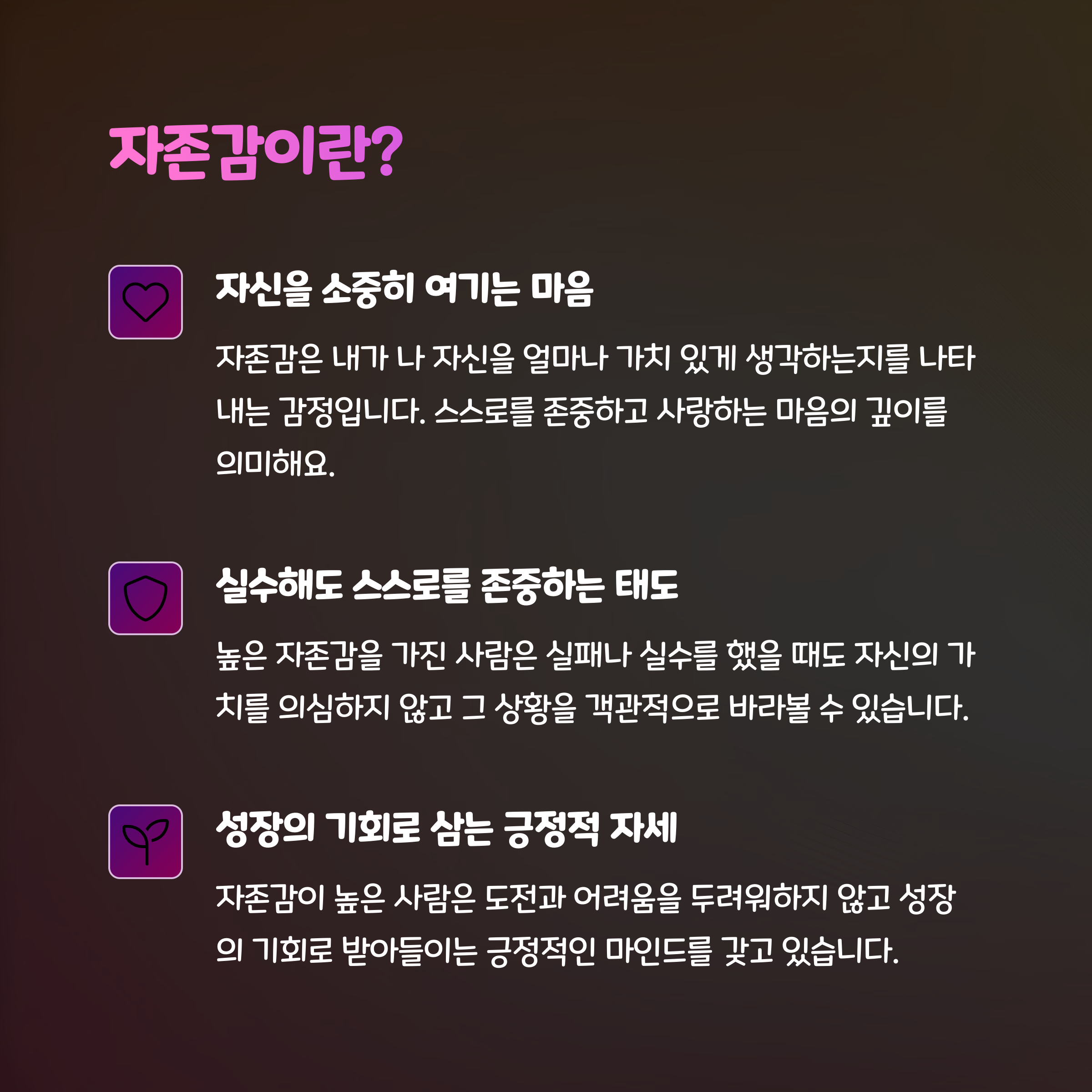 자존감이란 자신을 어떻게 생각하고 느끼는지를 나타내는 감정이에요. 내가 나 자신을 얼마나 소중히 여기고 있는지를 보여주는 것이죠. 자존감이 높다는 건, 실수하더라도 스스로를 존중하고 성장의 기회로 삼는 마음의 자세입니다.