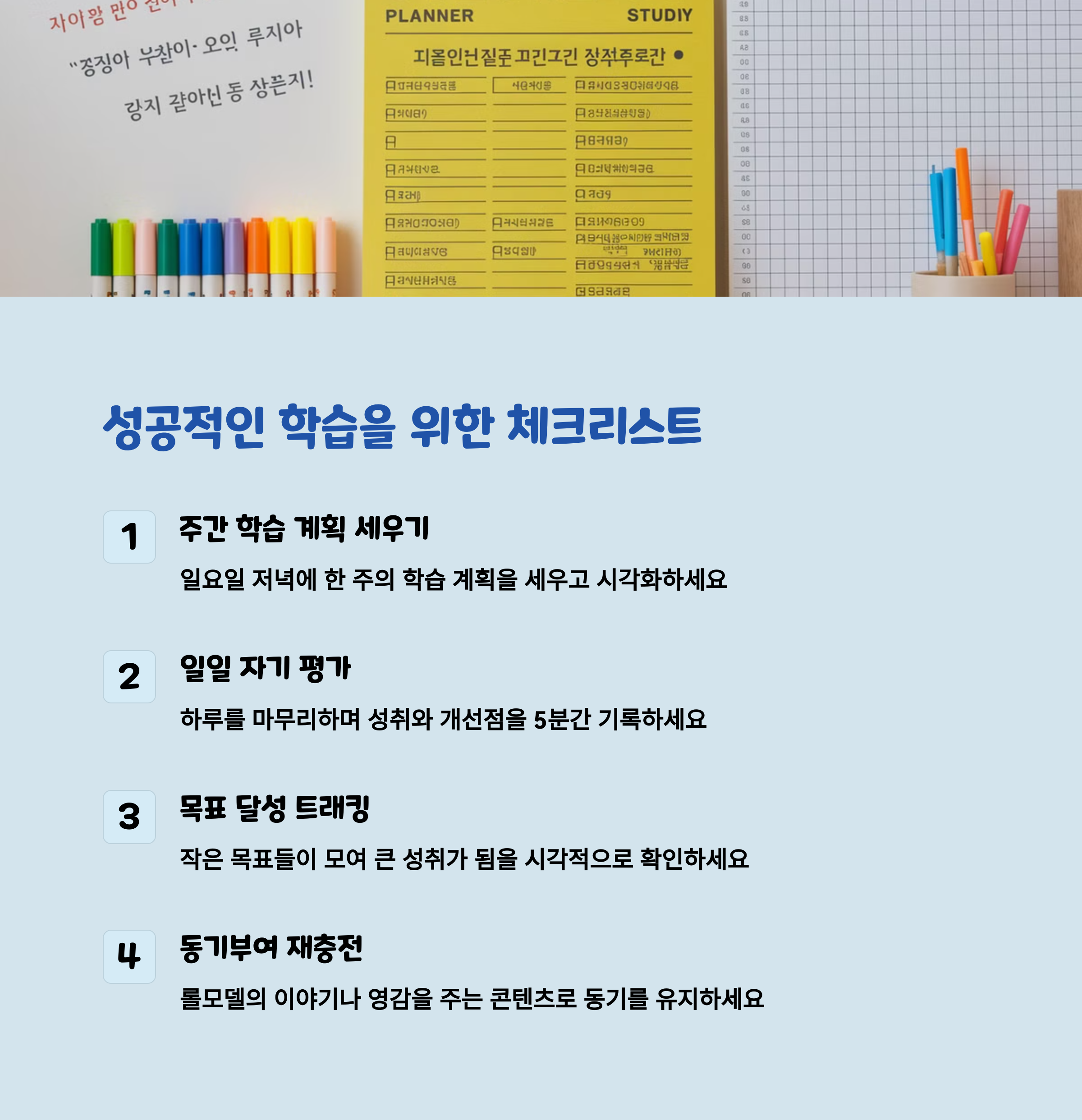 안녕하세요 여러분! 학습에 대한 동기를 부여하고 꾸준한 공부 습관을 만드는 일은 결코 쉽지 않죠. 특히 청소년들에게는 여러 가지 방해 요소들이 많기 때문에 자주 집중을 못 할 때가 많습니다. 오늘은 그 문제를 해결할 수 있는 방법들을 소개하려고 합니다. 함께 살펴보면서, 여러분도 학습에 대한 흥미를 찾고 더 나은 공부 습관을 만들 수 있길 바랍니다.