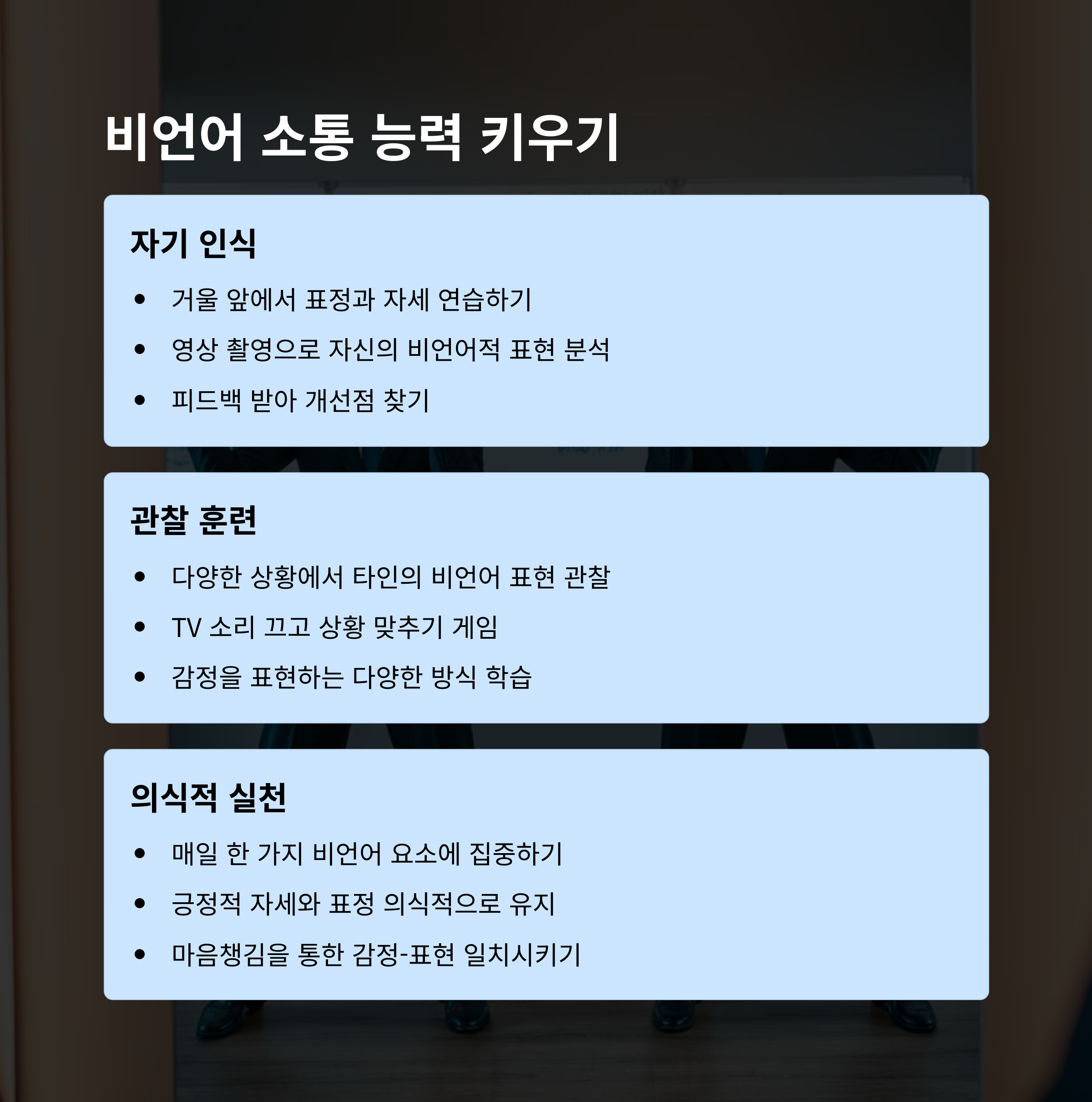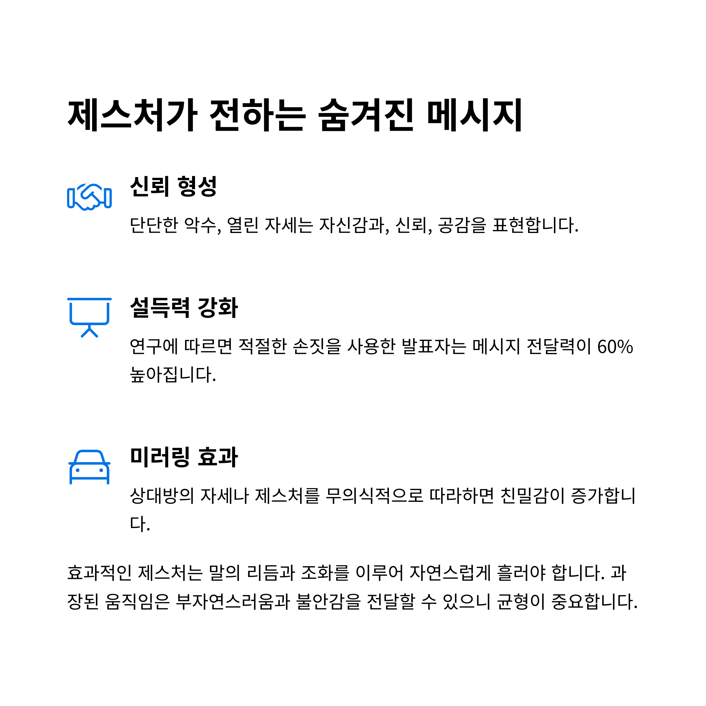 비언어적 소통은 단순한 말보다 더 깊은 신뢰와 감정을 전달하는 수단입니다. 제스처, 눈빛, 표정, 자세는 의도치 않게 우리의 생각을 전달하기도 하며, 이를 의식적으로 잘 활용하면 관계의 질을 높이고 소통의 정확성을 더할 수 있습니다.