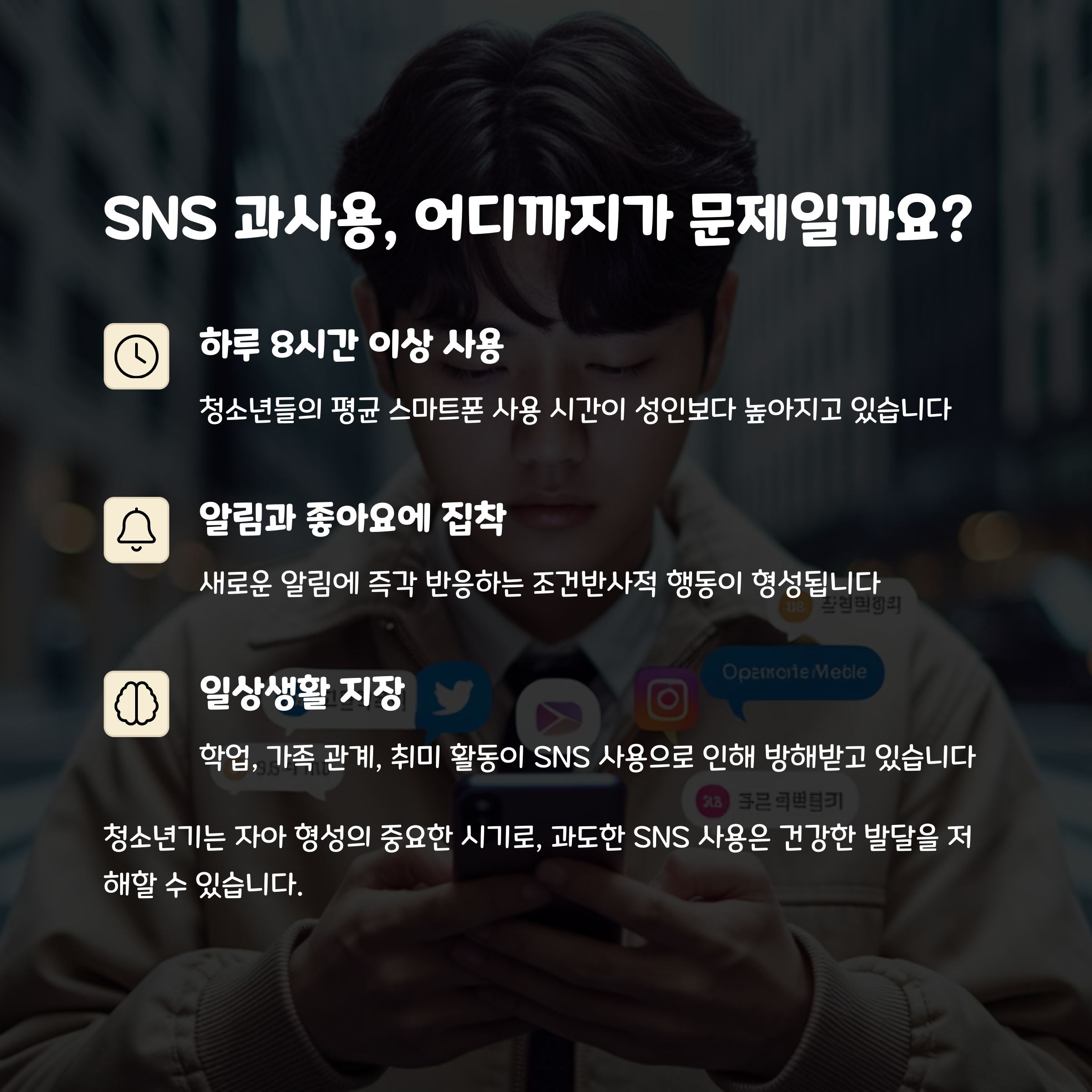 SNS는 분명 우리 삶에 많은 편리함을 가져다줍니다. 하지만 지나치게 의존하게 되면, 특히 성장기의 청소년에게는 정신 건강에 심각한 악영향을 줄 수 있어요. SNS 속 비교와 자극, 끝없는 피드백은 자존감을 흔들고 수면과 집중력까지 망가뜨릴 수 있습니다. 우리 아이들이 건강한 디지털 환경에서 자랄 수 있도록, 함께 관심을 갖고 지켜봐야 합니다. 사용을 조절하는 작은 실천이 큰 변화를 만들어낼 수 있어요. 오늘부터 함께 시작해보는 건 어떨까요?