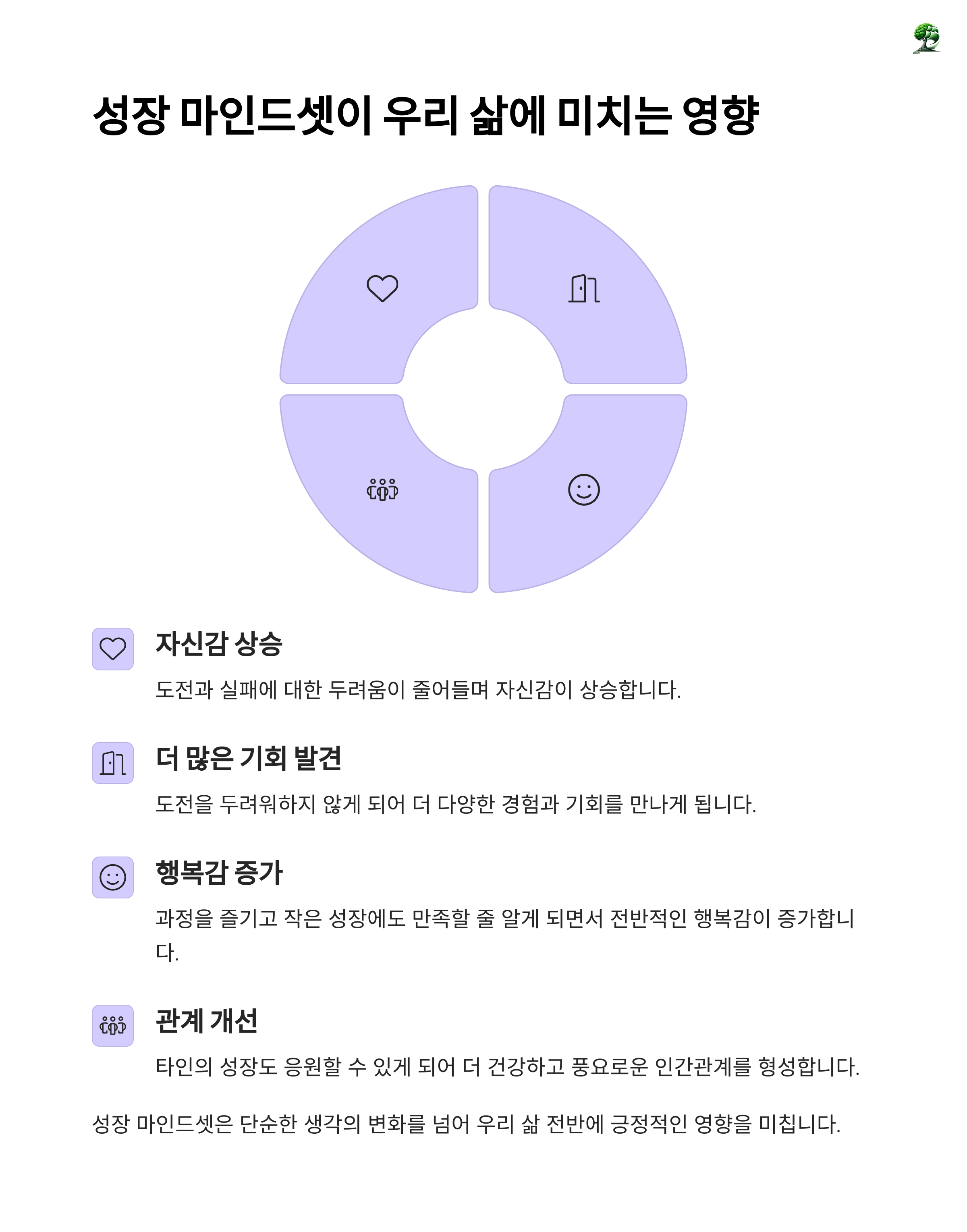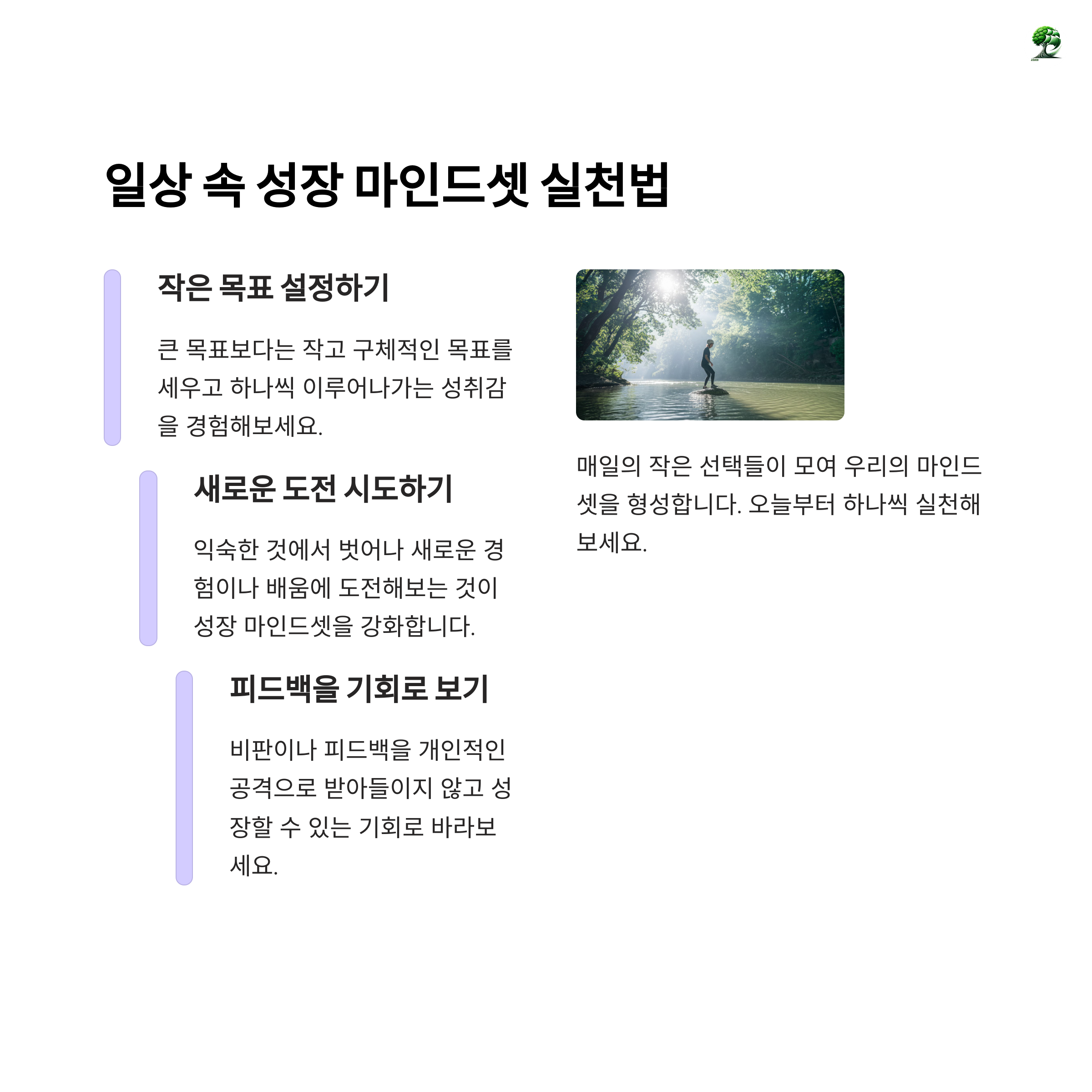 성장 마인드셋은 단순한 긍정이 아니라, 끊임없이 배우고 변화하려는 태도입니다. 실수를 인정하고 배우는 자세가 내일의 나를 더욱 단단하게 만들어줍니다. 오늘 하나라도 실천해본다면, 그것이 바로 변화의 시작입니다.